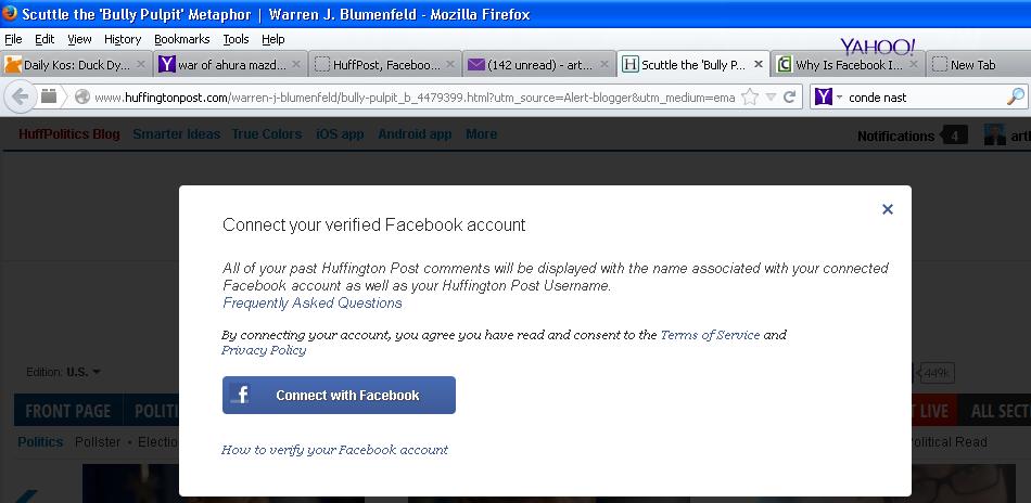 Today, nations, organizations, and schools are righteously blocking Facebook. Facebook promotes the sharing of personal information for marketing purposes, and to generate revenues for Facebook and companies that require it for verification of identities such as the pathetic HuffPost. Class action lawsuits have been launched against Facebook and those to whom it sold private information.[46. Tate, Ryan (November 19, 2009). “Facebook Named in Federal Class-Action Suit over Scammy Zynga Ads”. Valleywag. Read it online at http://gawker.com/5408472/facebook-named-in-federal-class+action-suit-over-scammy-zynga-ads. Retrieved December 21, 2013. The entire lawsuit is online at http://gawker.com/5408473/initial-complaint-in-swift-vs-zynga.] The crimes of scamming and misusing information from Facebook have been openly admitted to by CEO Mark Pincus[47. Text and video at http://techcrunch.com/2009/11/06/zynga-scamville-mark-pinkus-faceboo/.] who stated: “I did every horrible thing in the book just to get revenues.” Others to various degrees have admitted to the same ruse, limiting access or stealing identities, and so forth. Facebook is also sells ad to marketers who resort to tactics like using stolen pictures of apparent under-aged girls to promote their products.[48. http://gawker.com/5371305/facebooks-unauthorized-jailbait-ad-models.] Now, the once-respected HuffPost must be questioned about its illegal activities and actions as Big Brother demanding that all users join Facebook.