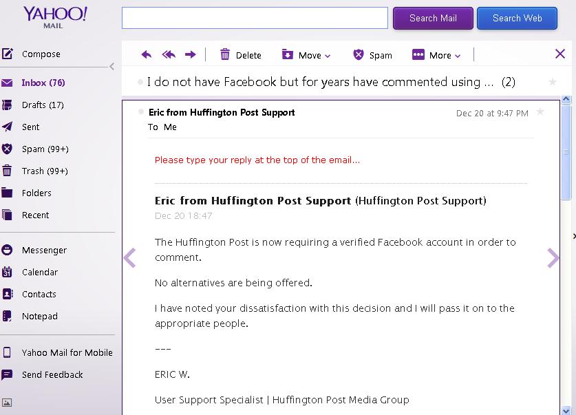 HuffPost declared that all users had to be on Facebook. That is Big Brother’s doublespeak and mind-control. International users are threatened regularly by Facebook, or feel shunned if they are not “Friend”(ed) by others on the social media site, with many committing suicide as a result of this policy and program that brings Zuckerberg millions in revenue.