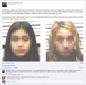 Here are the faces of the bullies (12-year-old Katelyn Roman and 14-year-old Guadalupe Shaw) who caused the suicide of Rebecca Sedwick. In keeping with HuffPost’s alleged dicta for full transparency, this is required–and I approve it. Age is irrelevant when it comes to a crime or a criminal.